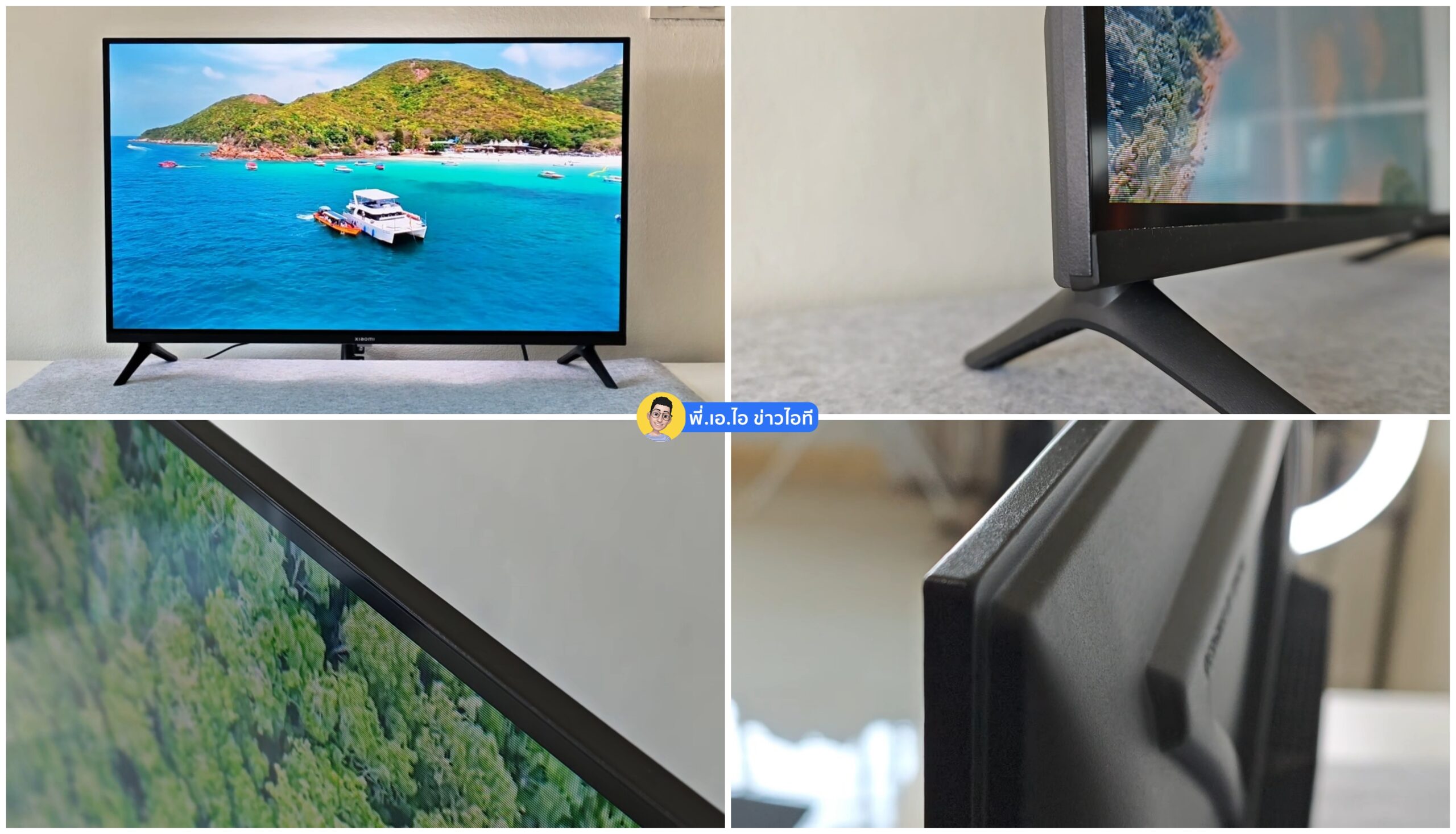 รุ่นนี้เป็นรุ่น 32 นิ้ว แต่ตัวเครื่องเล็กและบางหนักแค่ 3.2 กิโลกรัม สามารถยกได้สบาย ถ้าเทียบกับทีวี 32 นิ้วสมัยปีก่อนๆ จะหนาและหนักเลย การออกแบบจะคล้ายๆ Monitor คือ ขอบจอ 3 ด้าน บน ซ้าย ขวา จะไม่มีขอบ จะมีแค่ด้านล่างที่เป็นขอบโผล่มา อันนี้ส่วนตัวค่อนข้างชอบมาก เพราะมันดูเหมือนดูแบบเต็มจอ ไม่มีอะไรมาขัดตาดี และดูทันสมัยตลอดเวลา ตัวเฟรมขอบของทีวี ตัวนี้จะเป็นโลหะ เพิ่มความแข็งแรง เช่นมีอะไรมาโดนด้านขอบเฟรม ก็จะลดความรุนแรงลงไม่ให้กระทบจอด้านใน คือมันได้ทั้งความแข็งแรงกับความพรีเมี่ยมในตัวครับ