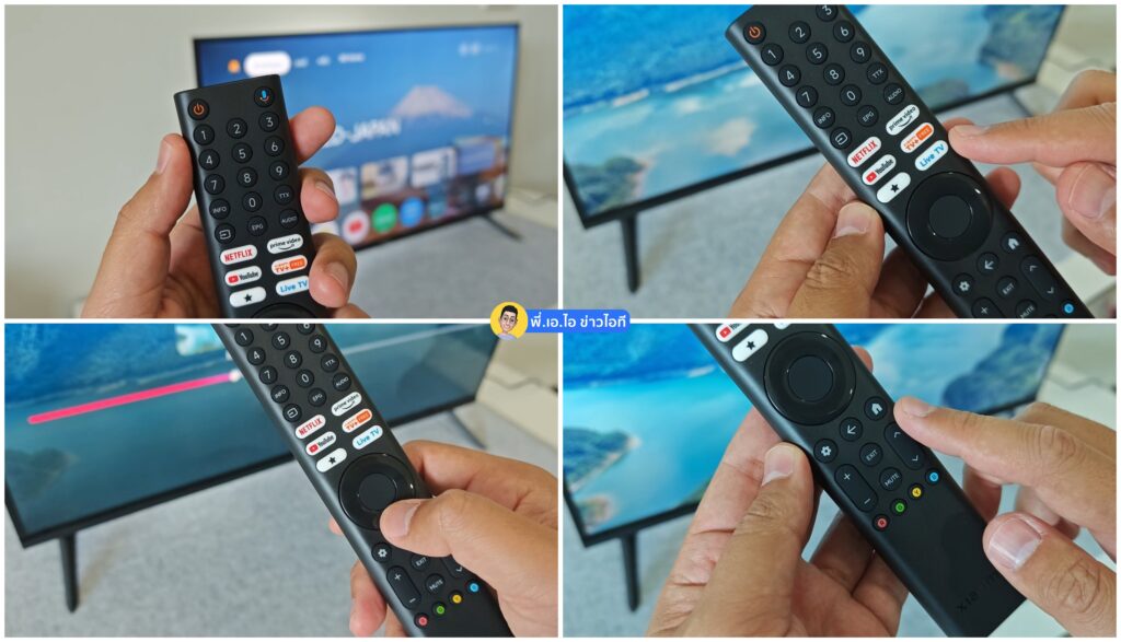 ในส่วนของรีโมทใช้ไม่ยากครับ ด้านบนที่เป็นปุ่มนี้จะเป็นของส่วนดูทีวีสด กดเลขช่องที่ต้องการ รีโมทรุ่นนี้รองรับการสั่งงานด้วยเสียงนะครับ เช่นสั่งงานผ่าน Google Assistant ถ้าจะใช้งานก็กดรูปไมค์สีฟ้าค้างไว้ แล้วพูดภาษาไทยได้เลยครับ แล้วก็การสั่งงานพูดเป็นตัวหนังสือก็ทำได้ครับ